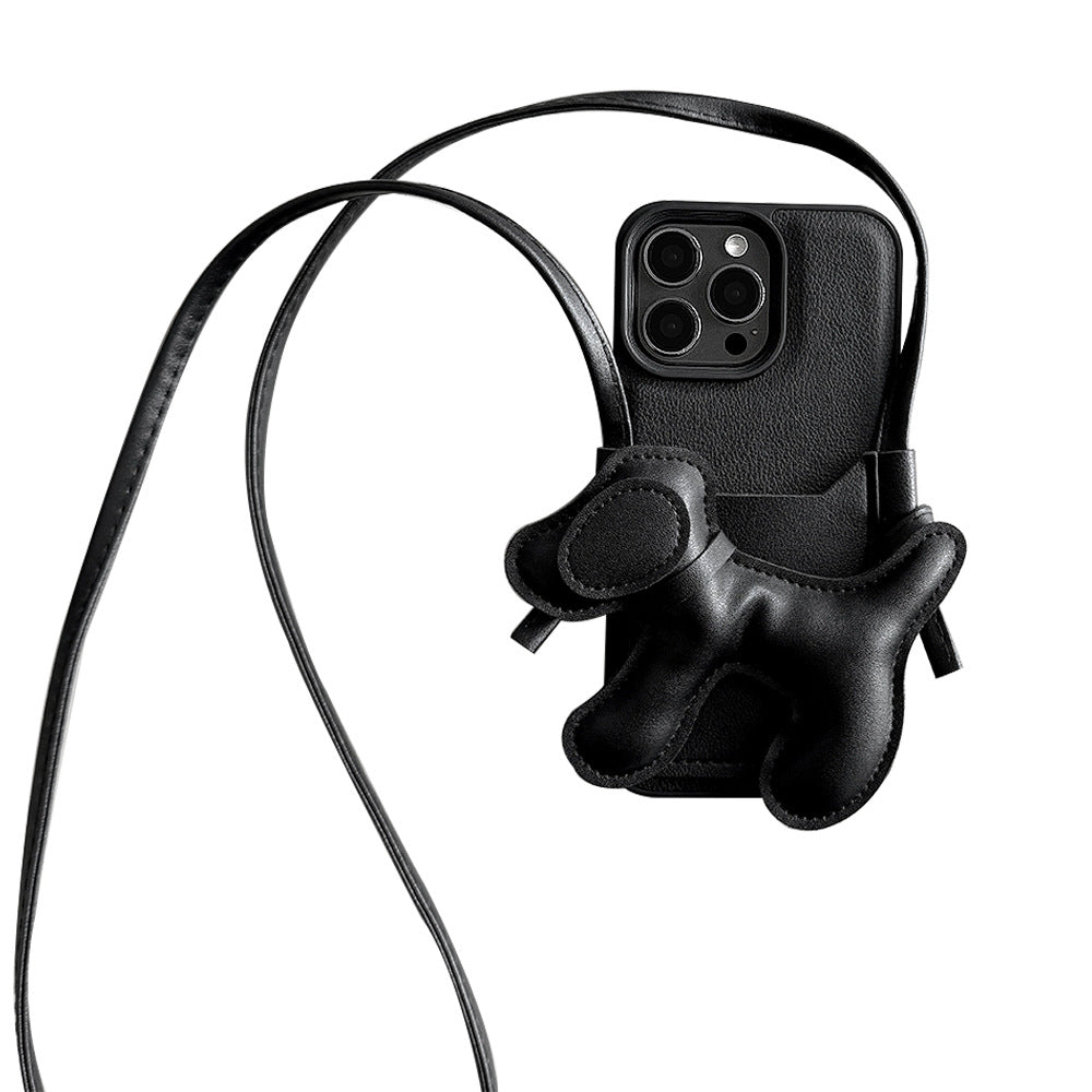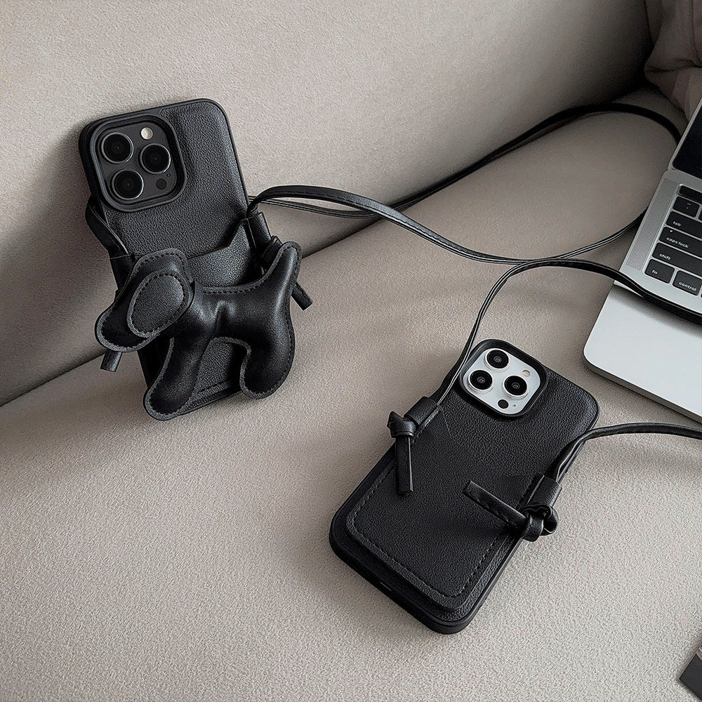 Black DIY puppy oblique span card bag for iPhone 16 mobile phone case iPhone17Pro max Internet celebrity 13 leather 15